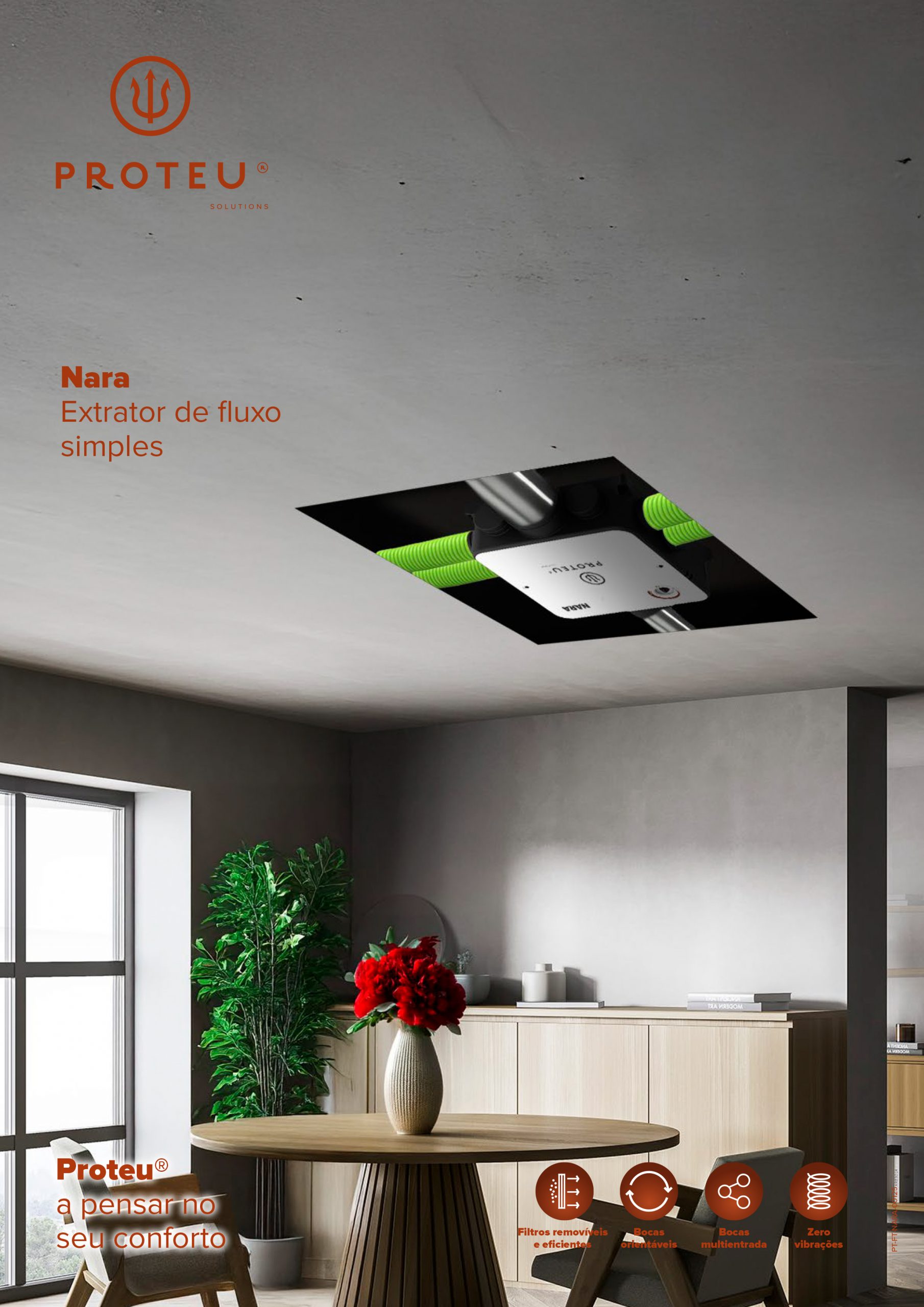 O Nara é um extrator para sistemas de ventilação de fluxo simples, desenvolvido para garantir eficiência e versatilidade em instalações residenciais ou comerciais. Com possibilidade de instalação tanto no teto como na parede, adapta-se facilmente aos diferentes layouts do projeto.
